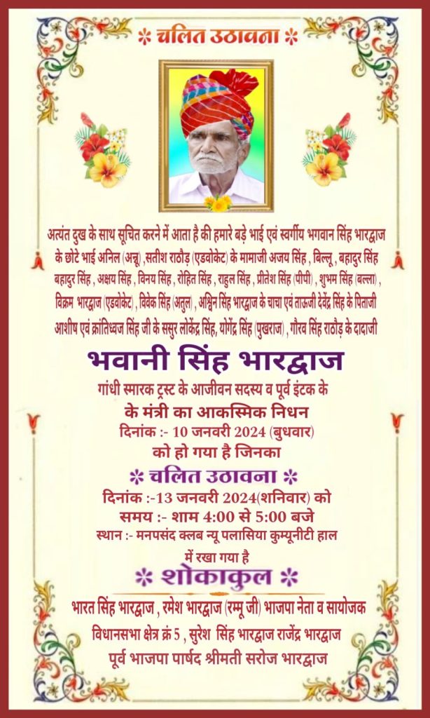 Condolence message (शोक संदेश)चलित उठावना adminJanuary 12, 2024January 12, 202401 mins श्री भवानी सिंह भारद्वाज Post navigation Previous: उठावनाNext: 10 कंपनियों में 176 युवाओं को दिलायी गई नौकरी Leave a Reply Cancel replyYour email address will not be published. Required fields are marked *Comment * Name * Email * Website Save my name, email, and website in this browser for the next time I comment.