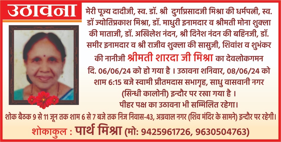 Eventsउठावना adminJune 8, 2024June 8, 202401 mins श्रीमती शारदा मिश्रा Post navigation Previous: प्रधानमंत्री मोदी के मुख्य सलाहकार डॉक्टर एच आर नागेंद्र 30 जून को इंदौर मेंNext: मालवा उत्सव 12 जून से लालबाग में, आदिवासी नृत्य और लोक कला को समर्पित होगा यह उत्सव Leave a Reply Cancel replyYour email address will not be published. Required fields are marked *Comment * Name * Email * Website Save my name, email, and website in this browser for the next time I comment.