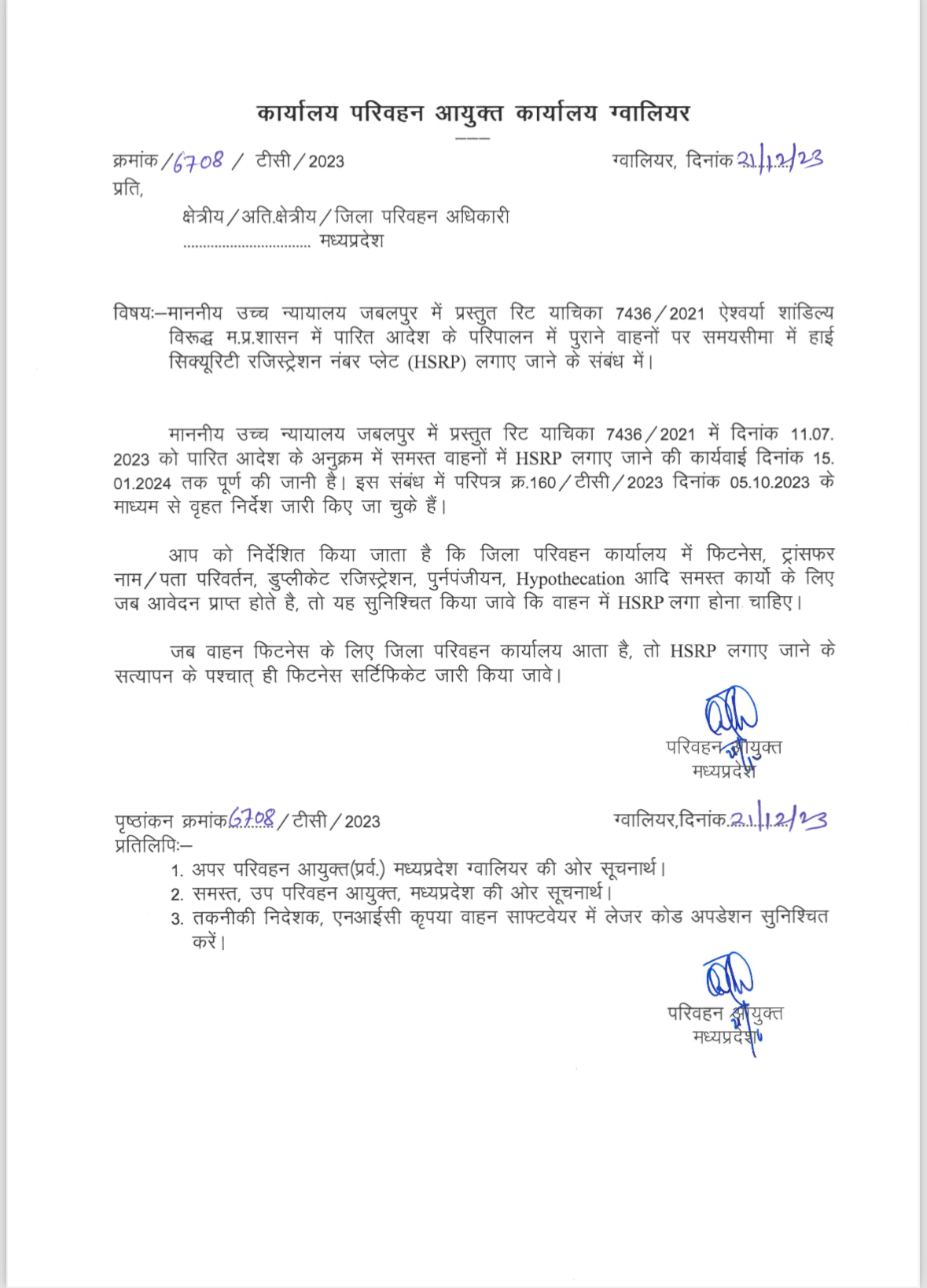 पुराने वाहनों के लिए परिवहन मुख्यालय से नए आदेश जारी होने के बाद अब बिना हाई सिक्योरिटी नंबर प्लेट के आरटीओ में आवेदन स्वीकार नही किया जाएगा। परिवहन कार्यालय में फिटनेस, ट्रांसफर नाम, पता परिवर्तन, डुप्लीकेट रजिस्ट्रेशन, पुर्नपंजीयन, Hypothecation आदि समस्त कार्यों के लिए जब आवेदन प्राप्त होते हैं, तो यह सुनिश्चित किया जाएगा कि वाहन में HSRP लगा होना चाहिए।