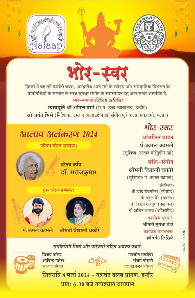 Eventsभोर स्वर 8 मार्च को adminMarch 5, 2024March 5, 202401 mins भोर स्वर 8 मार्च को Post navigation Previous: आज का राशिफल (05/02/24)Next: उज्जैन-इंदौर संभाग को धार्मिक-आध्यात्मिक सर्किट के रूप में विकसित किया जाए Leave a Reply Cancel replyYour email address will not be published. Required fields are marked *Comment * Name * Email * Website Save my name, email, and website in this browser for the next time I comment.