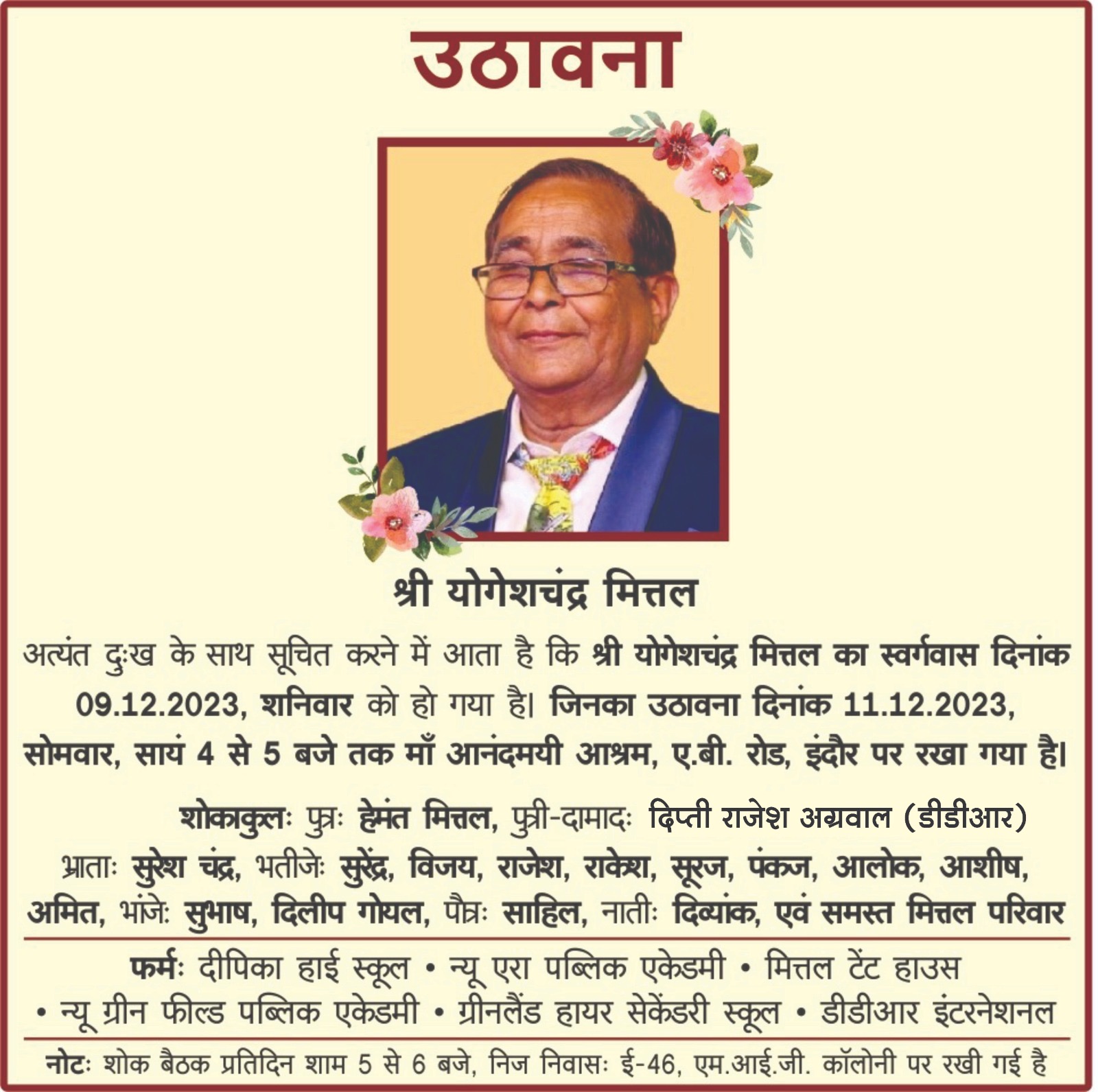 Condolence message (शोक संदेश)शोक संदेश adminDecember 10, 2023December 10, 202301 mins श्री योगेशचंद्र मित्तल Post navigation Previous: एमपी बोर्ड परीक्षा के लिए टाईम टेबल घोषितNext: भव्यातिभव्य स्नात्र महोत्सव 24 दिसम्बर को Leave a Reply Cancel replyYour email address will not be published. Required fields are marked *Comment * Name * Email * Website Save my name, email, and website in this browser for the next time I comment.