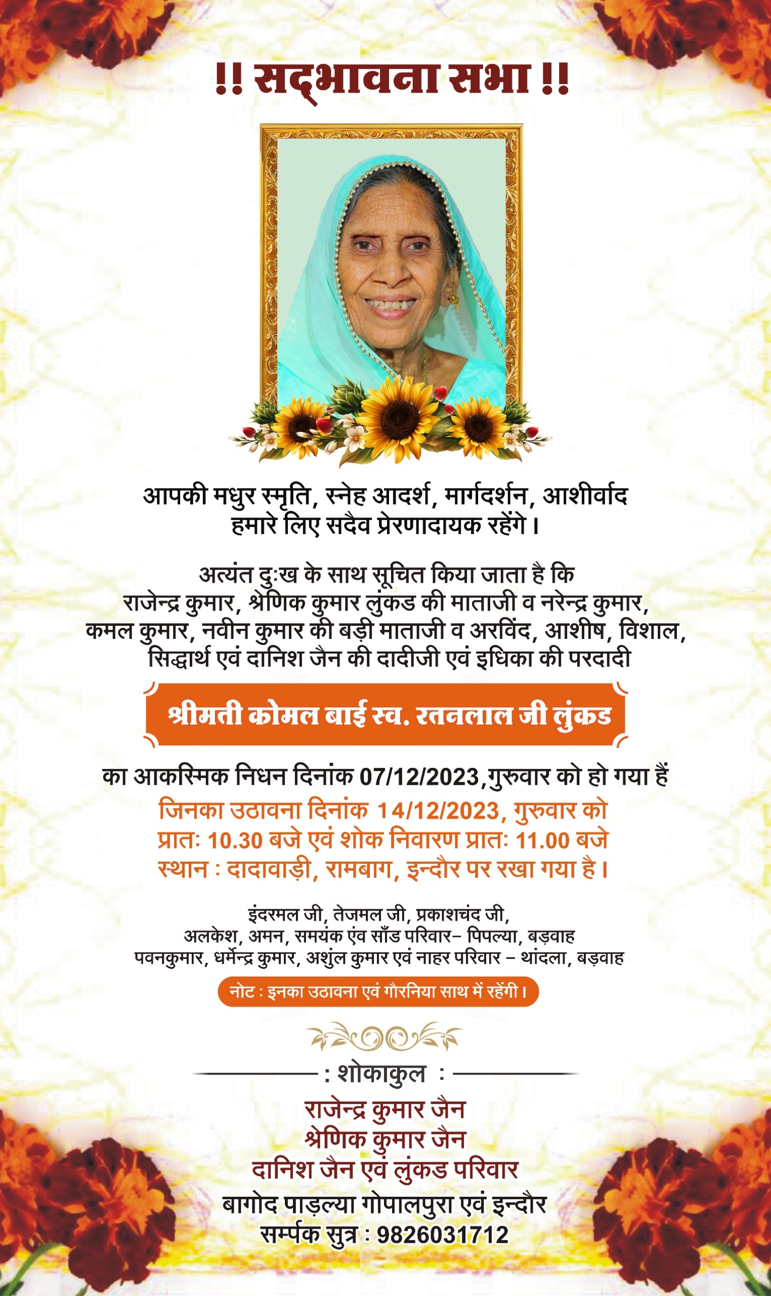 Condolence message (शोक संदेश)सद्भभावना सभा adminDecember 13, 2023December 13, 202301 mins श्रीमती कोमल बाई लुंकड़ Post navigation Previous: शवयात्राNext: आज का राशिफल (13/12/23) Leave a Reply Cancel replyYour email address will not be published. Required fields are marked *Comment * Name * Email * Website Save my name, email, and website in this browser for the next time I comment.