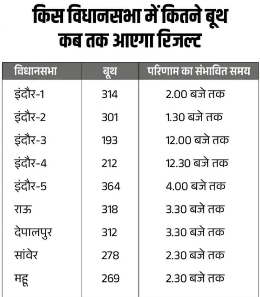 इंदौर जिले की 9 विधानसभा सीटों पर भी मतगणना 3 दिसम्बर को होगी। इस बार बुथ भी बढ़ाएं हैं ताकि बड़े विधानसभा क्षेत्रों में मतगणना में कम समय लगे। परिणाम संभावित रूप से कब तक आएँगे, इसकी तालिका इस प्रकार है।