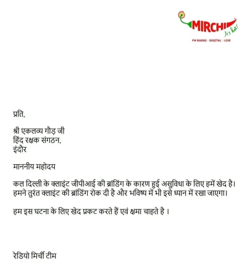 निपानिया स्थित होटल जार्डीन में इवेंट कम्पनी गरबा करवा रहीं थी। जहां अन्य स्टालों के साथ एक स्टॉल पर मुफ्त में सिगरेट पिलाकर सिगरेट कम्पनी का प्रचार किया जा रहा था। यह बात जब बीजेपी नेता एकलव्य गौड़ के संज्ञान में आयी तो उन्होंने तत्काल समाज में नशा परोसने वालों को स्टॉल हटाने की चेतावनी दी। स्थिति को भांपते हुए सिगरेट कम्पनी के प्रचार वाले स्टॉल को रेडियो मिर्ची ने तुरन्त बंद कर अपने कृत्य के लिए क्षमा मांगी।