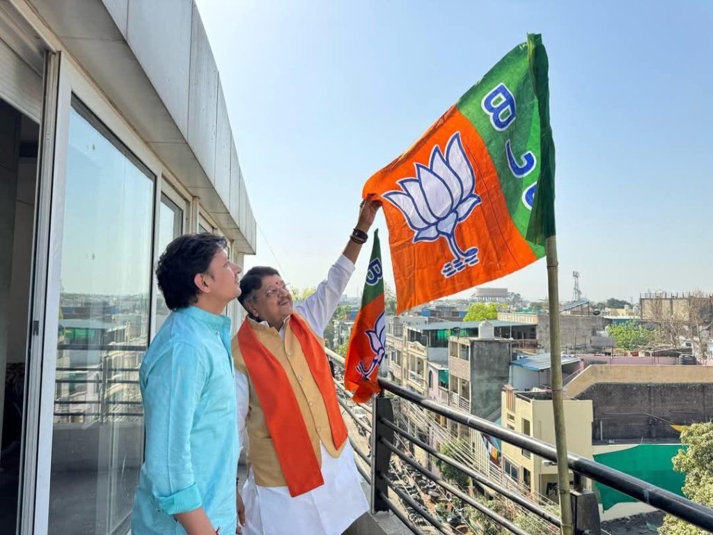 - स्थापना दिवस पर अपने निवास पर बीजेपी का झंडा लगाते मंत्री कैलाश विजयवर्गीय और पूर्व विधायक आकाश विजयवर्गीय