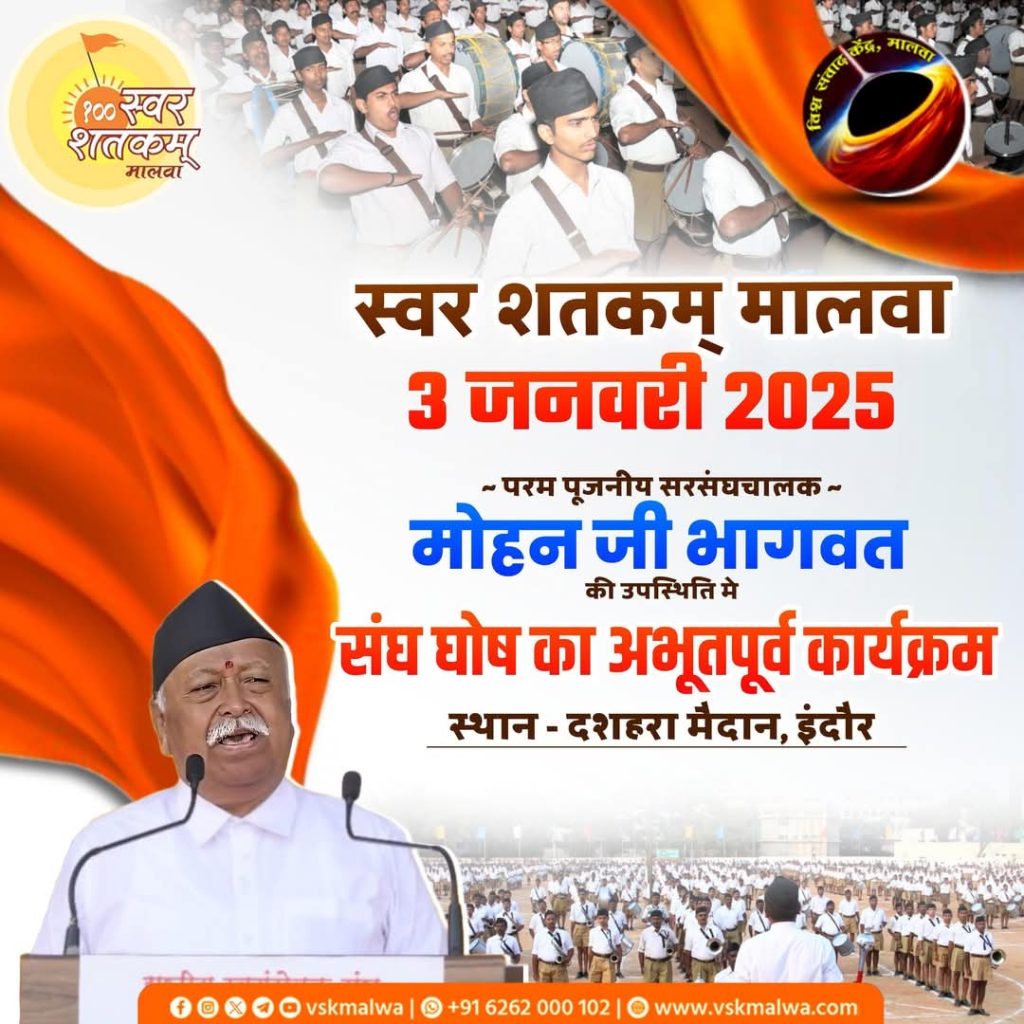- स्वर शतकम् मालवा, 3 जनवरी को दशहरा मैदान में डॉ. मोहन भागवत की उपस्थिति मे होगा घोष का अभूतपूर्व कार्यक्रम