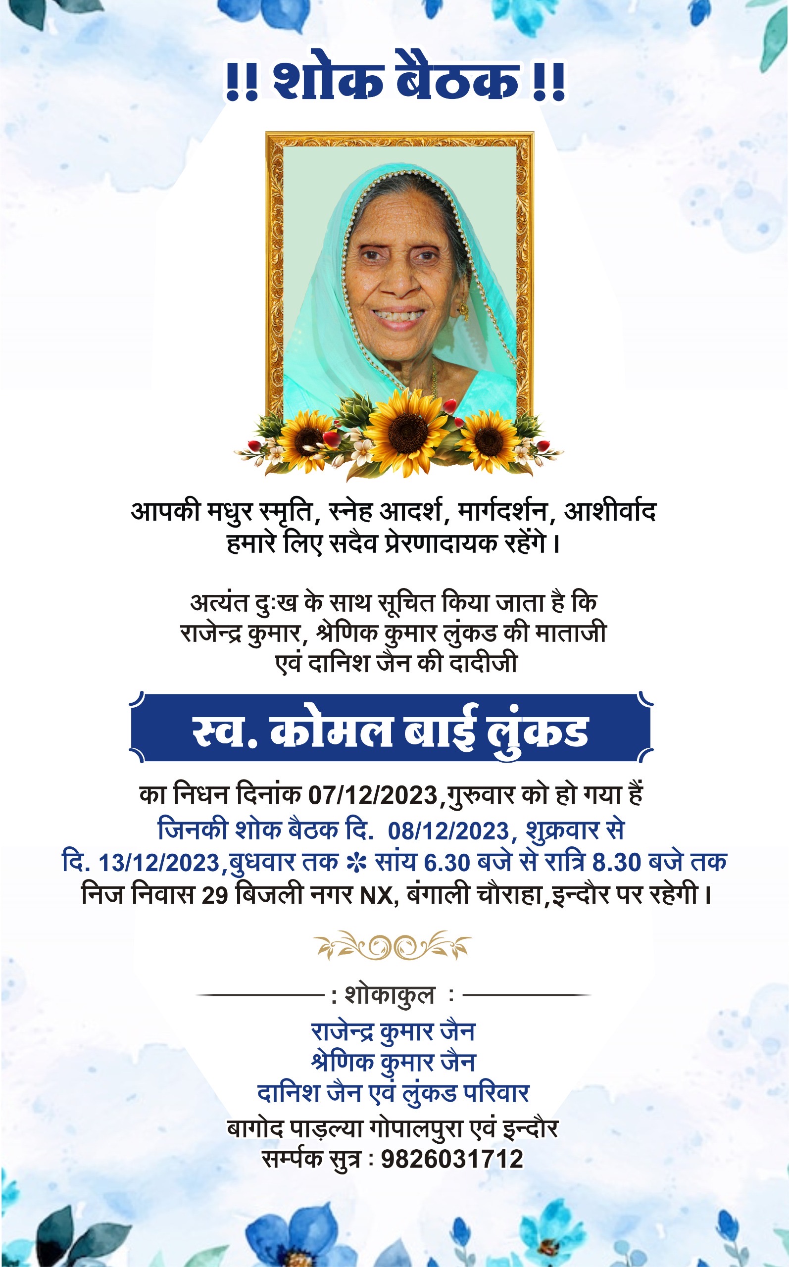 Condolence message (शोक संदेश)शोक संदेश adminDecember 9, 2023December 9, 202301 mins श्रीमती कोमल बाई लुंकड़ Post navigation Previous: दुआओं का बैंक बैलेंस, शिवानी दीदी का उद्बोधन 5 जनवरी कोNext: इंदौर में 14 दिसम्बर से प्रारंभ होगी विकसित भारत संकल्प यात्रा Leave a Reply Cancel replyYour email address will not be published. Required fields are marked *Comment * Name * Email * Website Save my name, email, and website in this browser for the next time I comment.