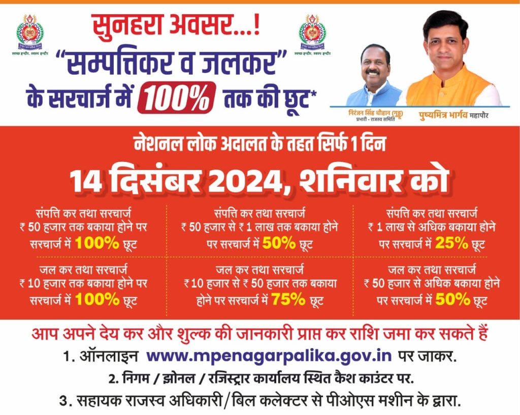 दिनांक 14/12/2024 को नगर निगम द्वारा आयोजित लोक अदालत मे अपना बकाया संपत्तिकर व जलकर जमा कर पाये सरचार्ज में 100% तक की छूट
